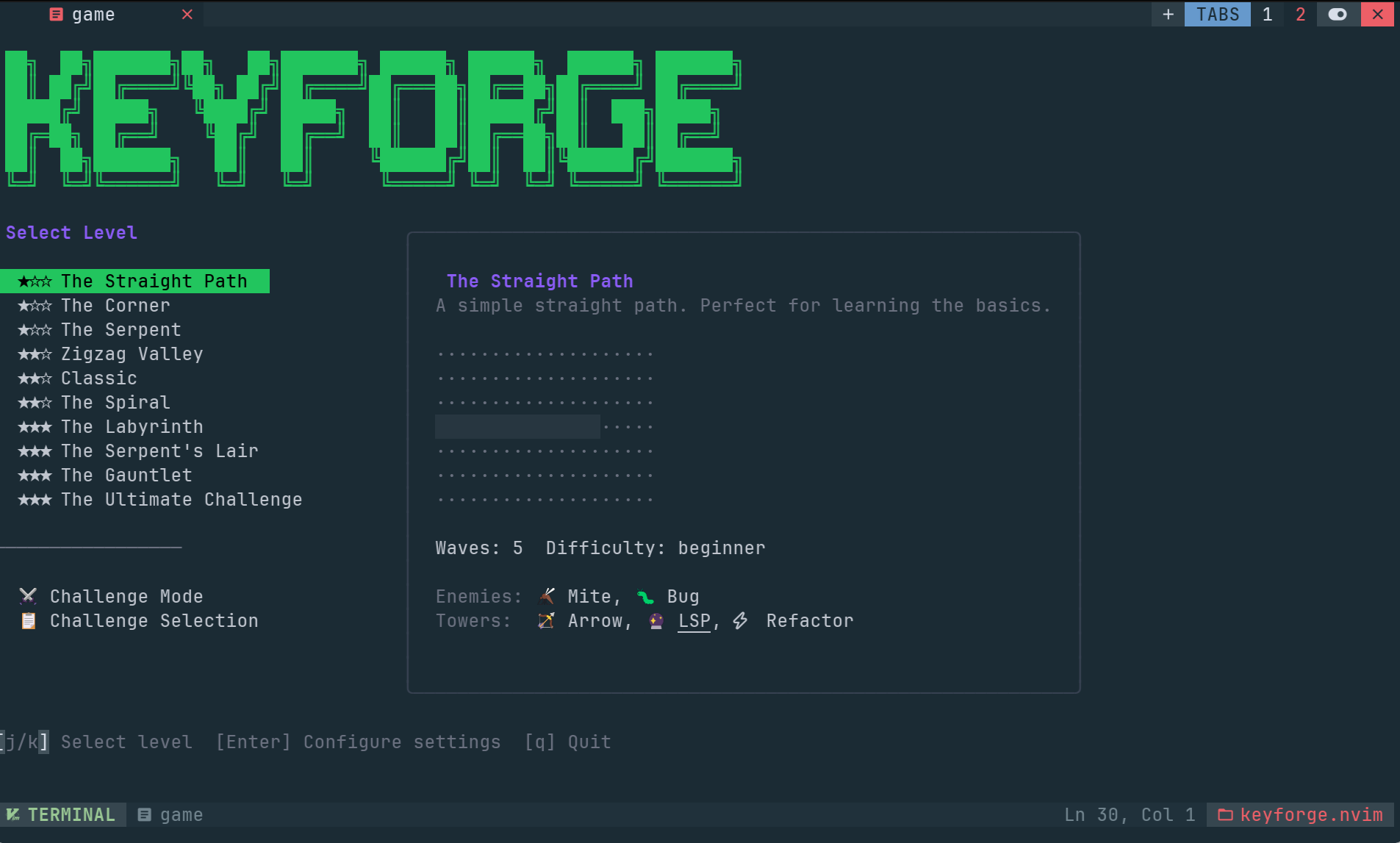 A tower defense game integrated into Neovim that gamifies learning vim keybindings and plugin workflows. Place towers, complete kata-style editing challenges to earn gold, and defend against waves of enemies across 10 unique levels.